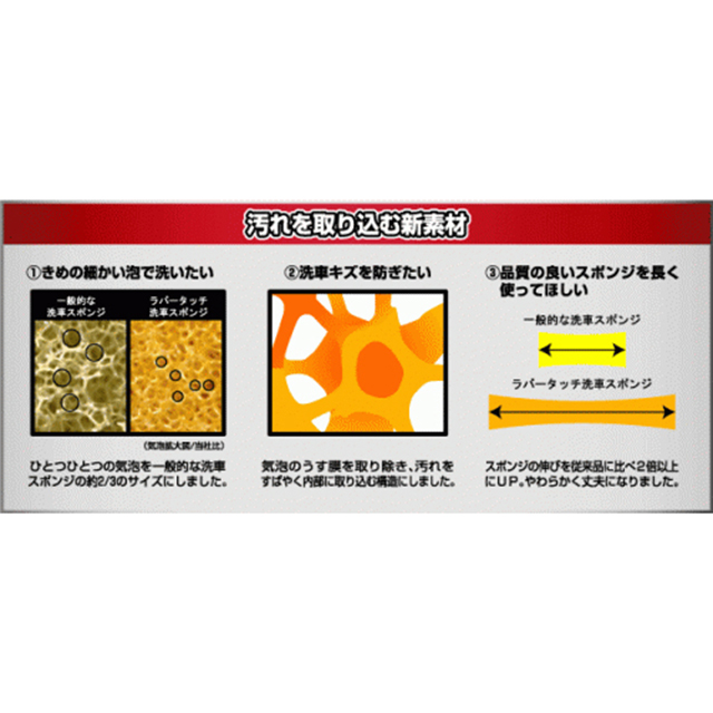 ②洗車キズを防ぎたい・・・気泡のうす膜を取り除き、汚れをすばやく内部に取り込む構造にしました。